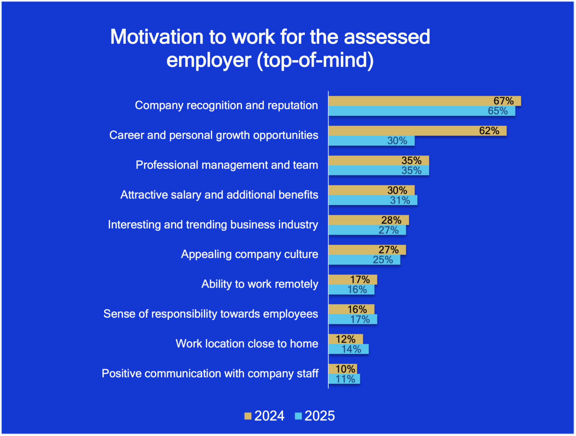 The survey data shows that employer choice is influenced by multiple factors – while brand recognition remains important, career opportunities, leadership, team environment, and compensation play a key role. It is evident that employee decision-making is becoming more pragmatic, with greater emphasis on development, stability, and the quality of everyday work.